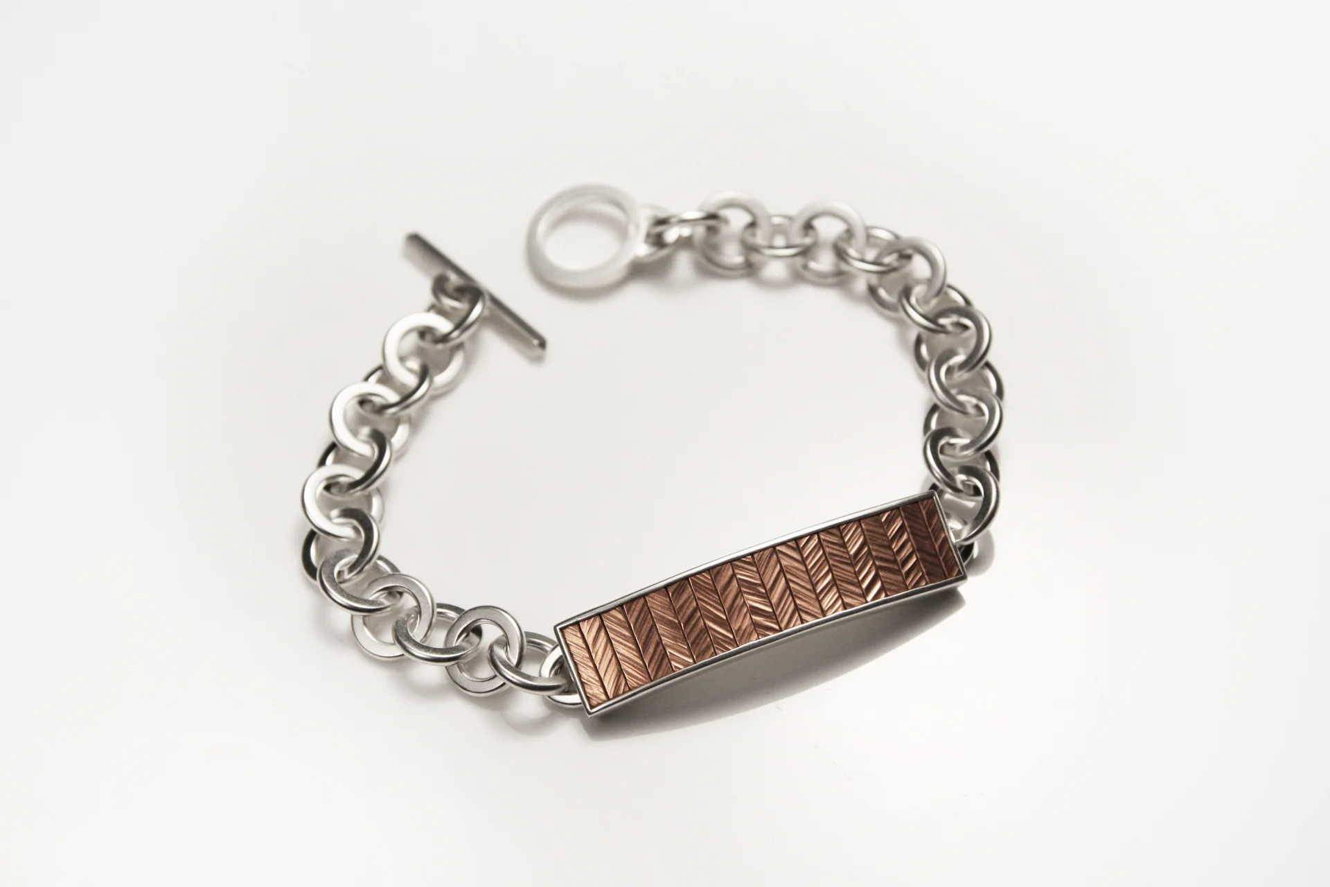 The herringbone pattern found in woven textiles became the initial inspiration for this collection. To achieve this effect in metal Alexia uses cross-peen hammer to individually texture bars of metal. The pieces are then cut to length and inlayed in silver enclosures of various shapes and sizes. The copper offers a rich and warm reflective surface that patinas beautifully as the jewelry is worn, highlighting the textural effect of the hammer-work.